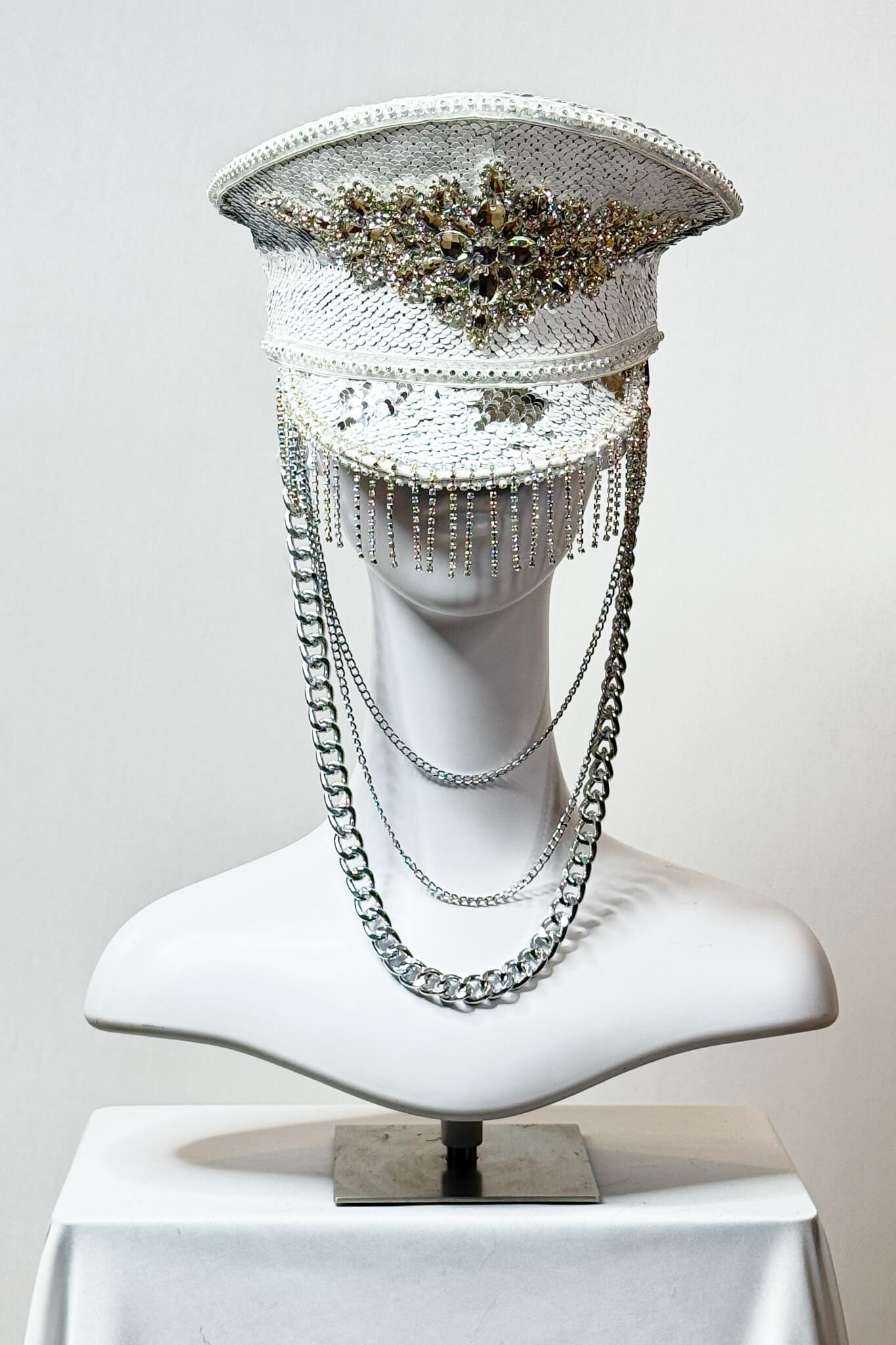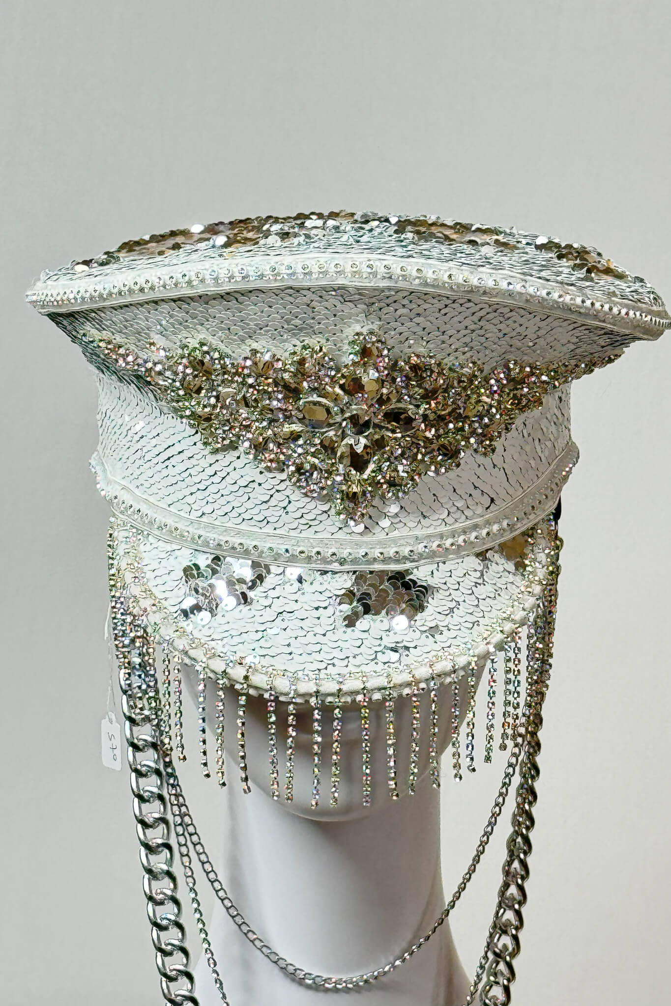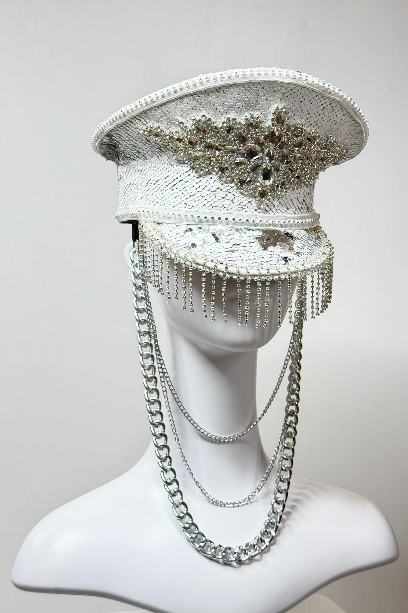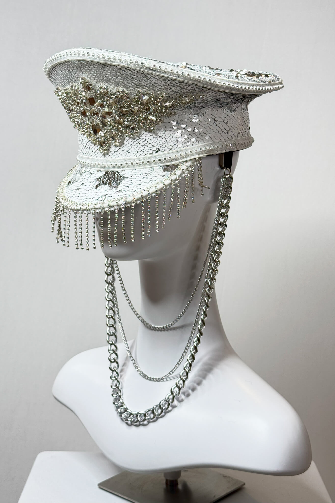 Handmade captain’s hat, covered with sequins in a combination of white and gold. Decorated with an iron gold chain.