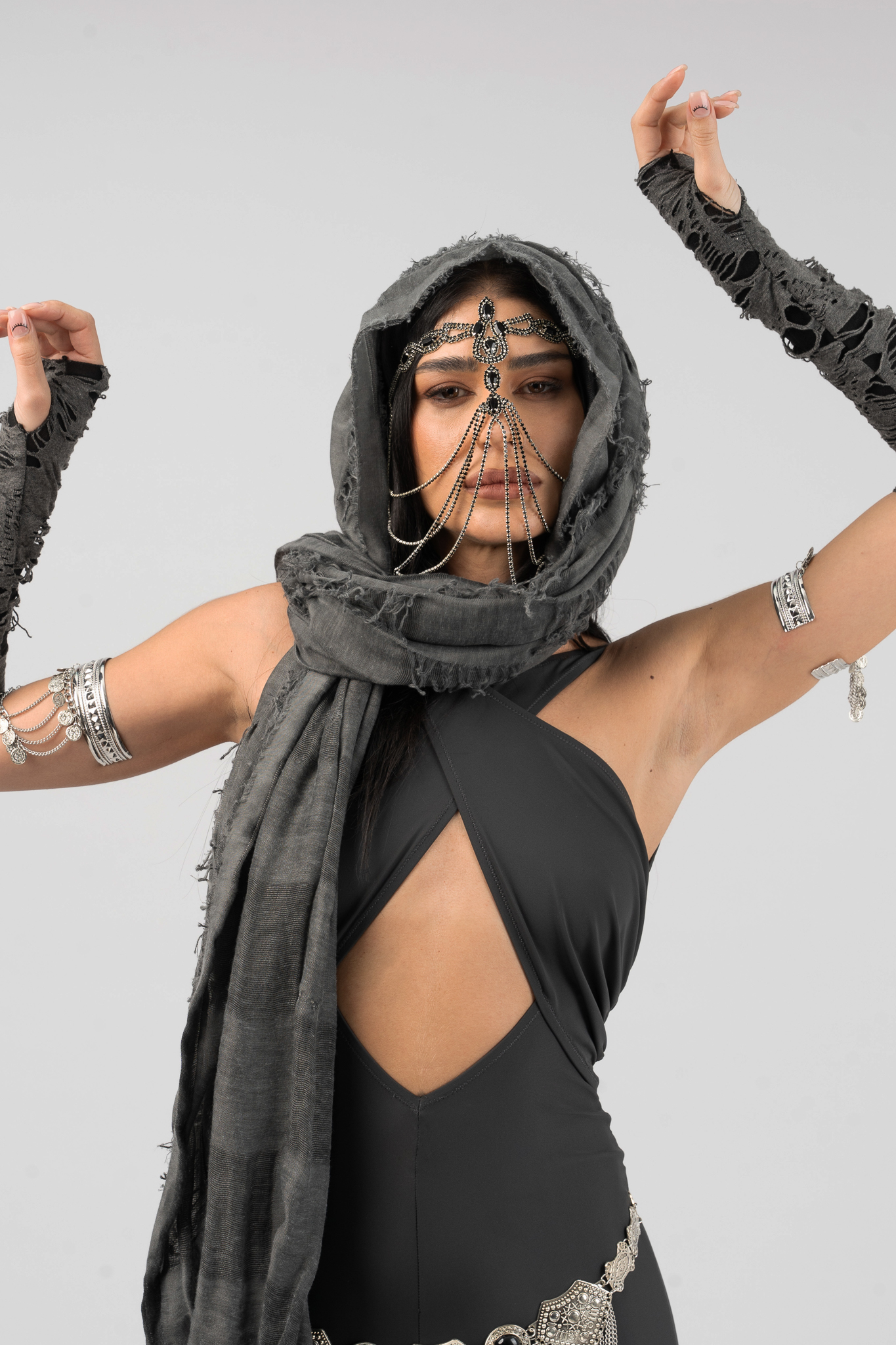 A face jewelry for a woman in an ethnic design, decorated with zircons, with a rubber closure at the back for optimal fit and comfort on the face.