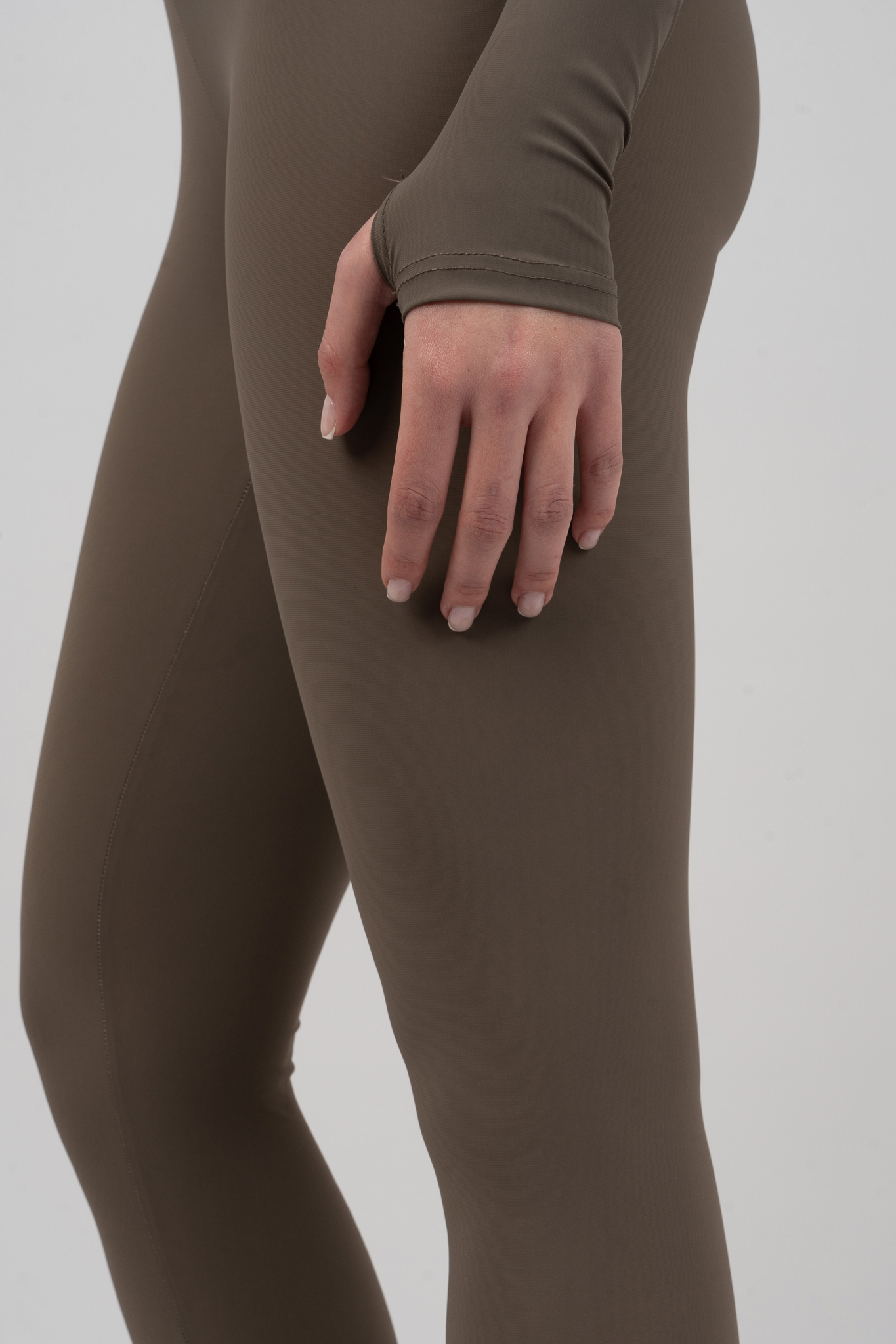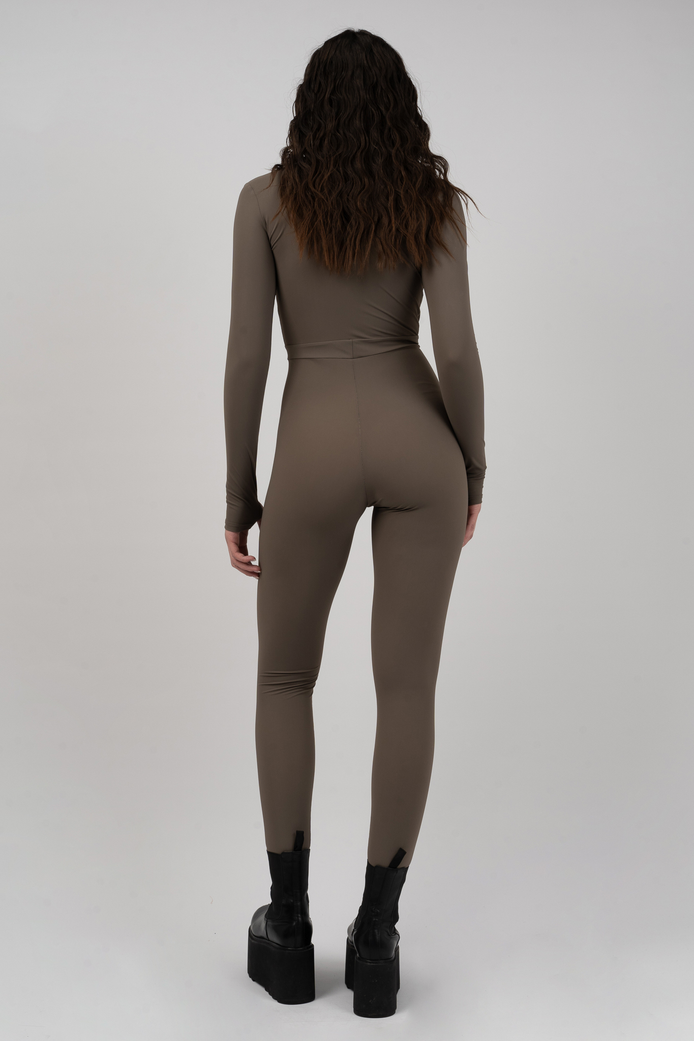 Women’s jumpsuit with a fitted cut, deep V-neck, and long sleeves with thumbhole detail.