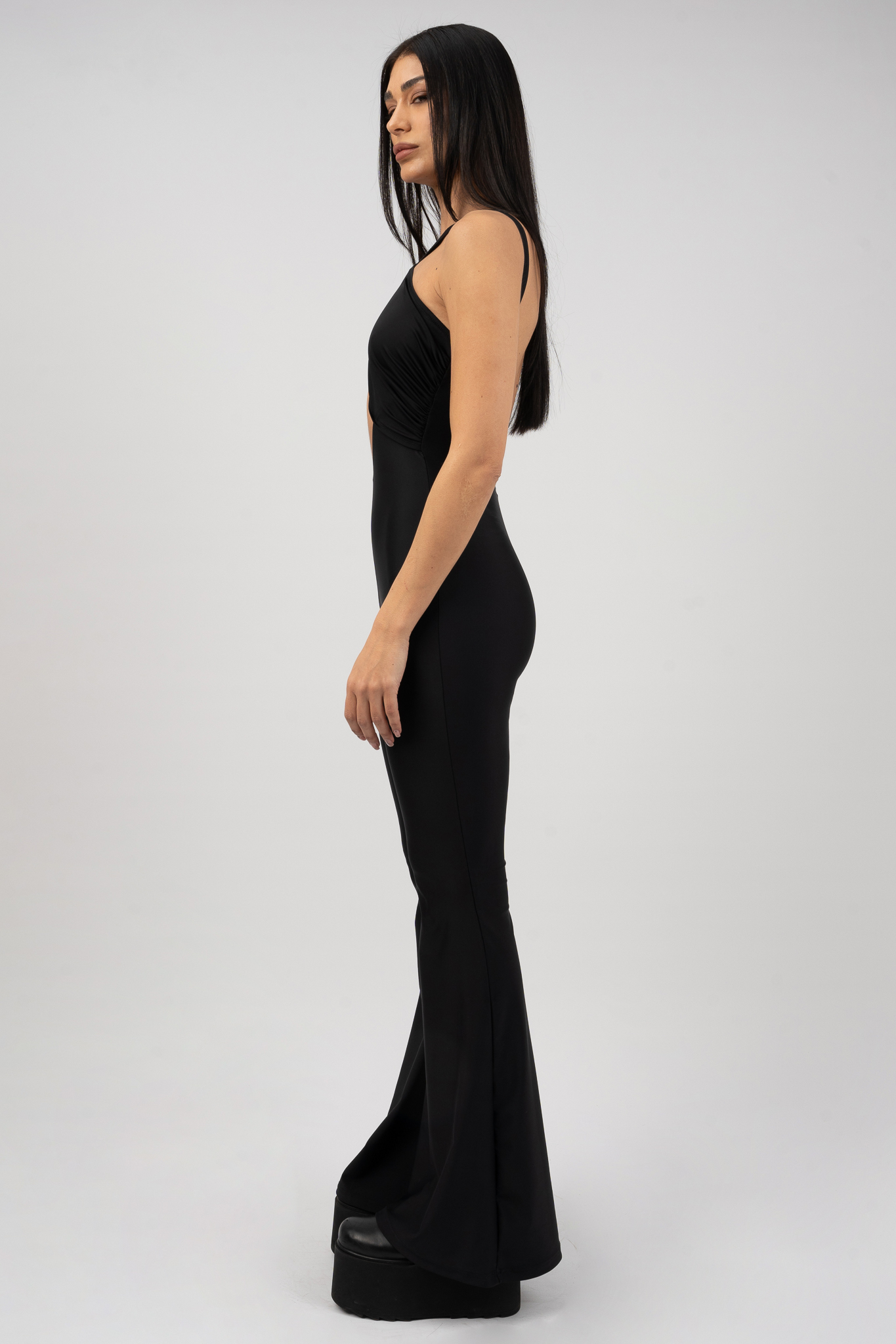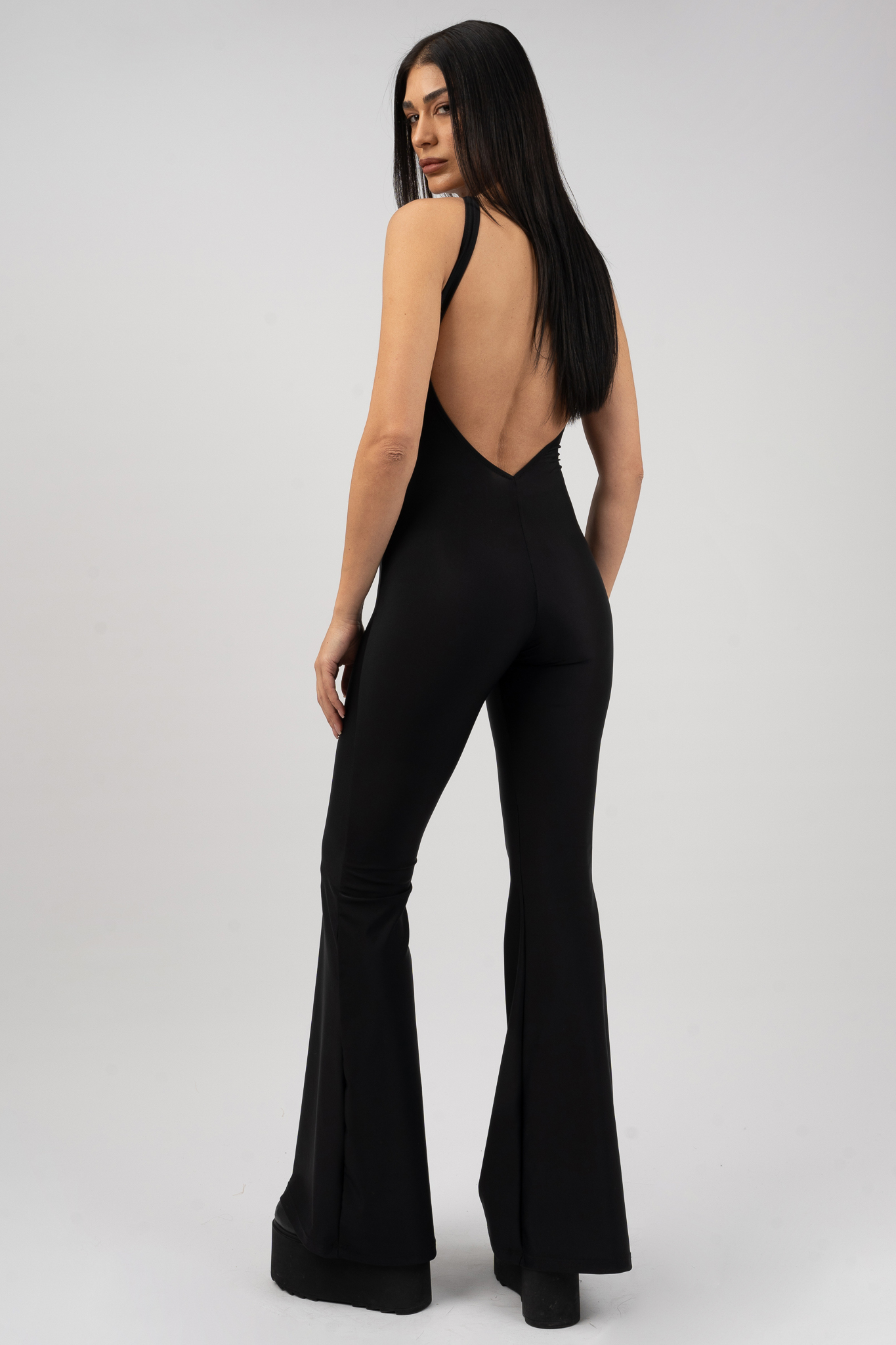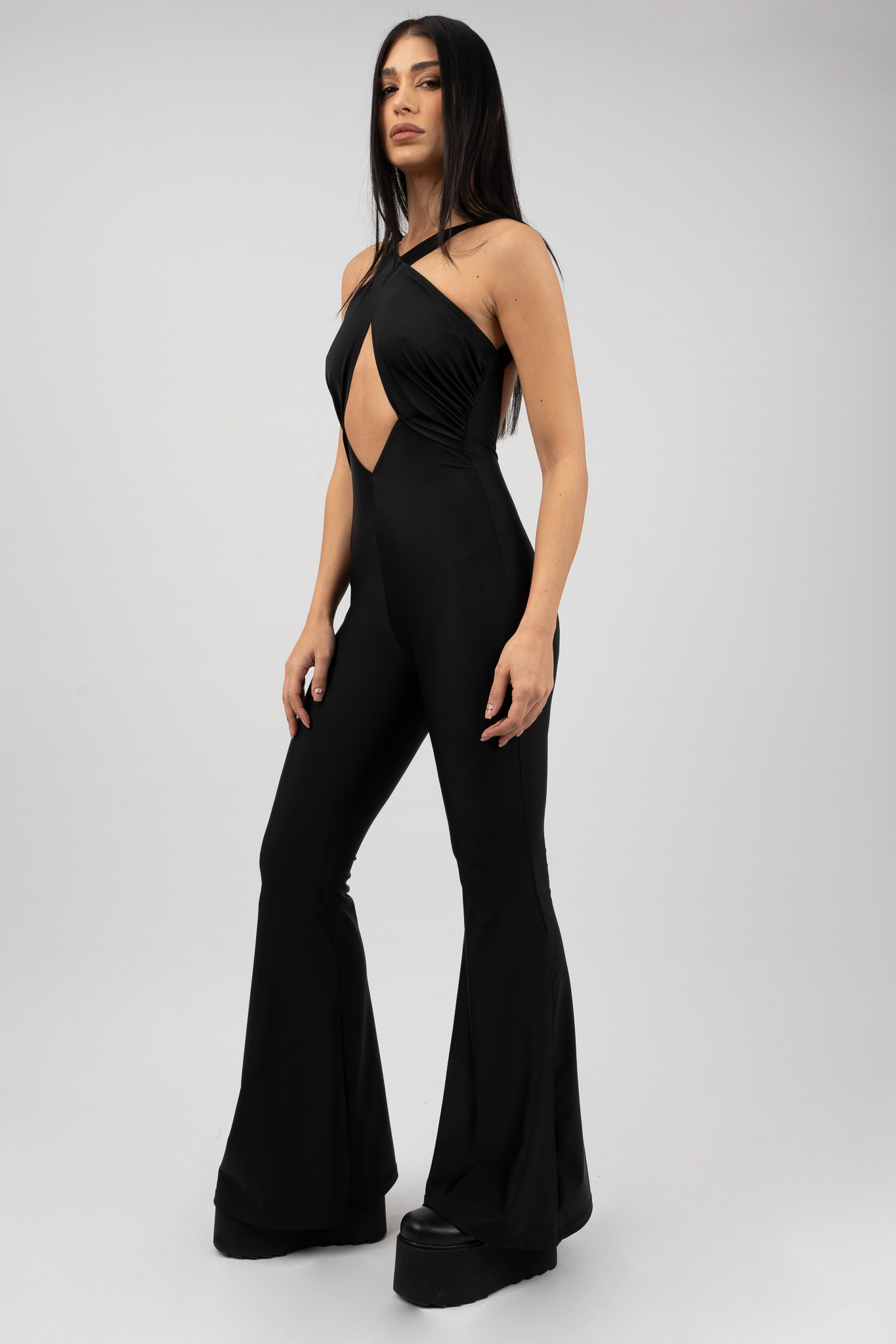 Women’s jumpsuit with a flared cut, crossover neckline, and open back.